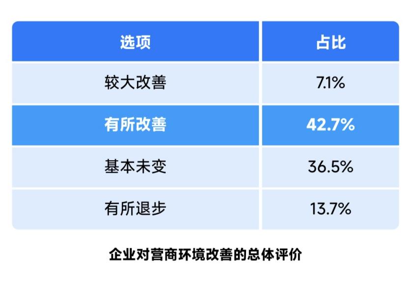 受調(diào)企業(yè)認(rèn)為營商環(huán)境改善的占比49.8%,其中認(rèn)為有較大改善占比7.1%,36.5%的企業(yè)認(rèn)為營商環(huán)境基本未變,13.7%的企業(yè)認(rèn)為營商環(huán)境有所退步,反映出在一些行業(yè)或地區(qū)民營經(jīng)濟(jì)政策落實仍然存在不足。