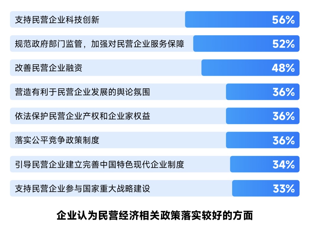 問卷調(diào)查結(jié)果顯示,受調(diào)企業(yè)對民營經(jīng)濟(jì)相關(guān)政策落實效果感受最好的是“支持民營企業(yè)科技創(chuàng)新”(56%)、“規(guī)范政府部門監(jiān)管,加強(qiáng)對民營企業(yè)服務(wù)保障”(52%)和“改善民營企業(yè)融資”(48%)。其它依次為:“營造有利于民營企業(yè)發(fā)展的輿論氛圍”(36%)、“依法保護(hù)民營企業(yè)產(chǎn)權(quán)和企業(yè)家權(quán)益”(36%)、“落實公平競爭政策制度”(36%)、“引導(dǎo)民營企業(yè)建立完善中國特色現(xiàn)代企業(yè)制度”(34%)、“支持民營企業(yè)參與國家重大戰(zhàn)略建設(shè)”(33%)