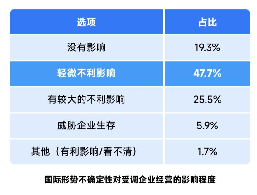 中美貿(mào)易戰(zhàn)等外部不利因素對中國經(jīng)濟(jì)造成了較大不確定性,問卷顯示,47.7%的企業(yè)認(rèn)為受“輕微不利影響”,19.3%的企業(yè)表示“沒有影響”,合計占67%,這是因受調(diào)企業(yè)來自第三產(chǎn)業(yè)的中小企業(yè)占比居多,主要服務(wù)于國內(nèi)消費市場。25.5%的企業(yè)受到“較大不利影響”,5.9%的企業(yè)反映“威脅企業(yè)生存”,合計占31.3%。