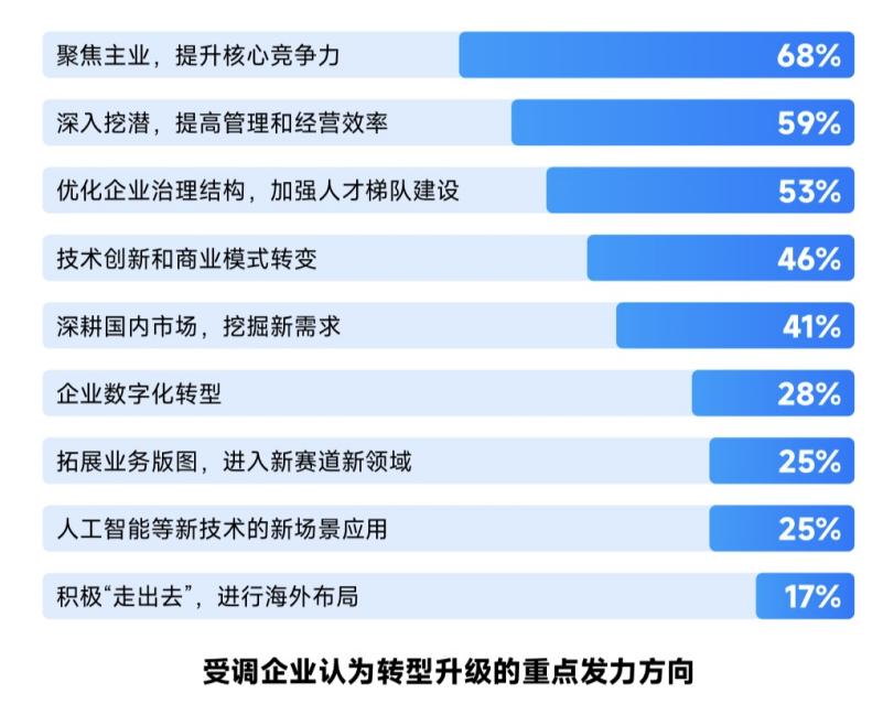 受調(diào)企業(yè)68%選擇要“聚焦主業(yè),提升核心競爭力”,反映了強(qiáng)化核心優(yōu)勢是當(dāng)前企業(yè)發(fā)展戰(zhàn)略中的普遍共識。59%的企業(yè)選擇“深入挖潛,提高管理和經(jīng)營效率”,53%的企業(yè)選擇“優(yōu)化企業(yè)治理結(jié)構(gòu),加強(qiáng)人才梯隊建設(shè)”,說明強(qiáng)化企業(yè)管理和人才隊伍建設(shè)是企業(yè)重要的轉(zhuǎn)型動力。其他依次為 “技術(shù)創(chuàng)新和商業(yè)模式轉(zhuǎn)變”(46%),“深耕國內(nèi)市場,挖掘新需求”(41%)、“企業(yè)數(shù)字化轉(zhuǎn)型”(28%),“拓展業(yè)務(wù)版圖,進(jìn)入新賽道新領(lǐng)域”(25%)、“人工智能等新技術(shù)的新場景應(yīng)用”(25%),反映出大部分中小企業(yè)對數(shù)字化、高新技術(shù)應(yīng)用還處在觀望階段。17%的企業(yè)選擇“積極“走出去”,進(jìn)行海外布局”。