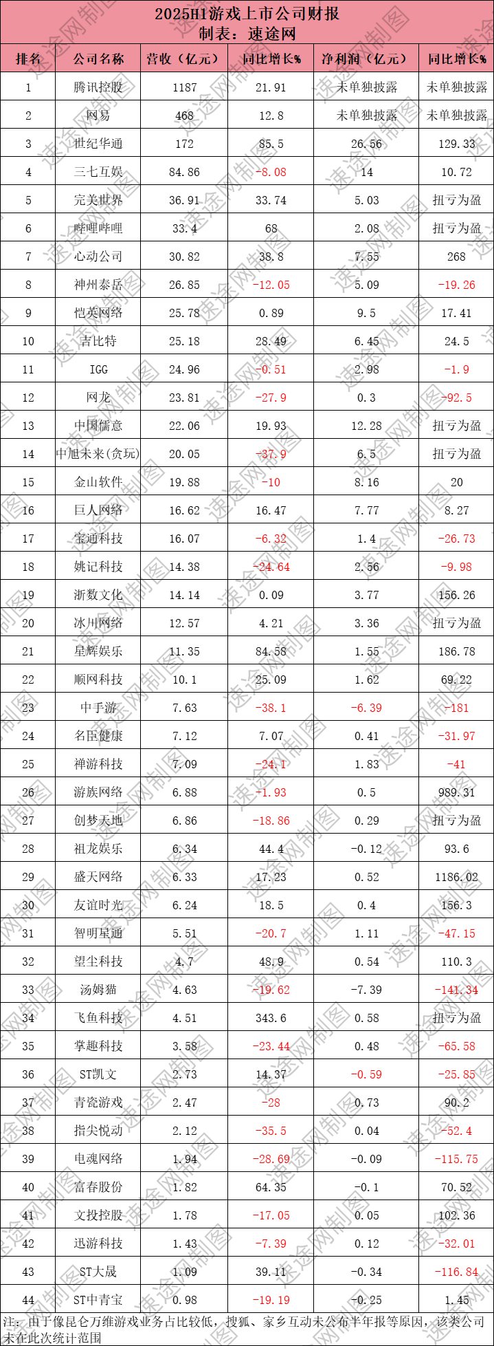 據速途網不完全統計,已發布半年報的44家游戲上市公司中(含A股、港股及美股中概股),營收同比增長的占23家,21家出現營收下滑;凈利潤增速也是差異顯著,其中16家出現凈利潤大幅下滑,7家游戲上市公司實現扭虧為盈,游戲行業上半年整體業績向好。