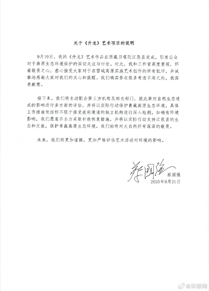 蔡國強工作室同步致歉,表示“存在考慮不周”,愿配合檢測及恢復(fù)措施。