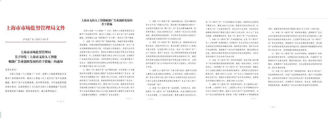2025年上海國際廣告節開幕式上,上海市市場監管局正式發布《上海市支持人工智能賦能廣告業創新發展的若干措施》。這份文件包含12條具體措施,覆蓋了從智能體研發、算力支持到人才培育和生態集聚的全產業鏈。
