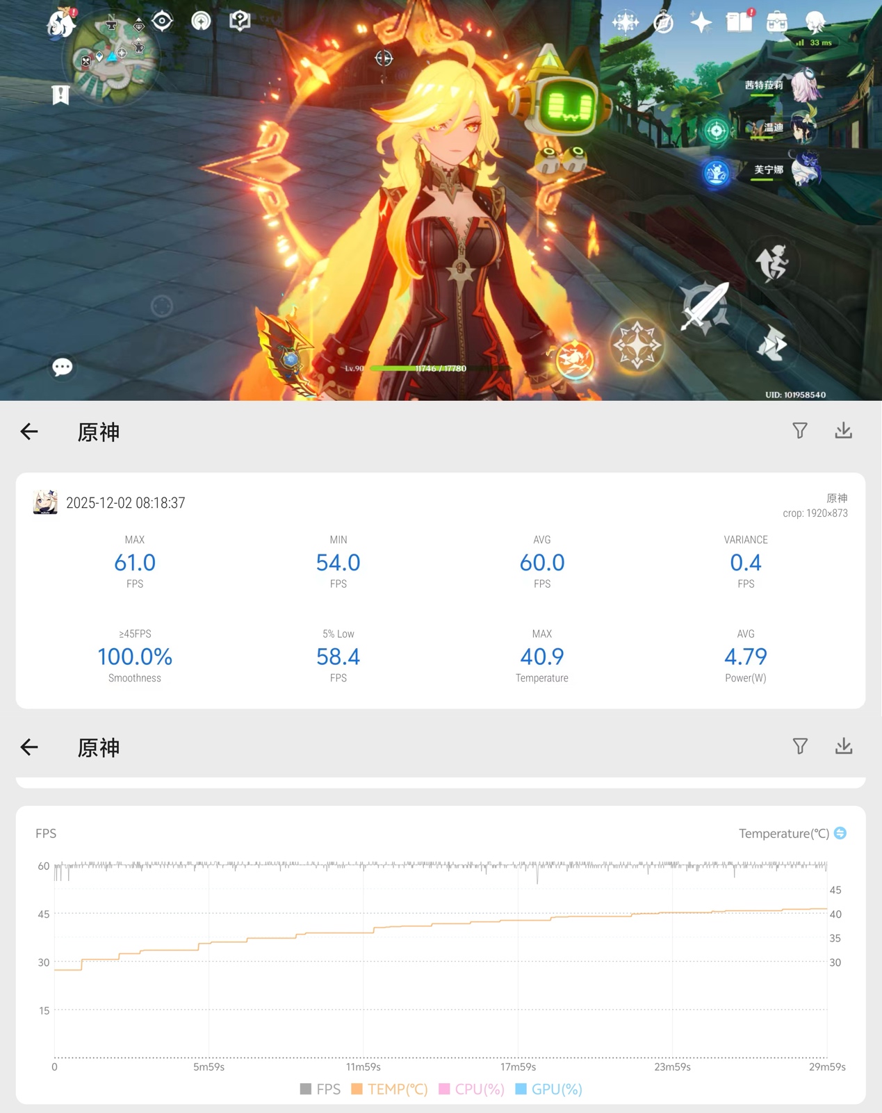 《崩壞:星穹鐵道》對 CPU 調度和 GPU 光影渲染的雙重壓力更大。實測過程中,將所有畫面選項開到最高。黃金時刻場景中,連續30分鐘運行后,整機的溫控策略以穩定優先,平均幀率高達58.0FPS。